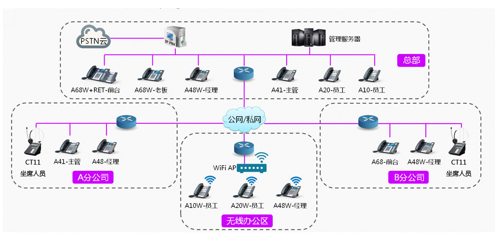 有的企业是百兆网络,有的企业是千兆网络,还有企业部分区域无法拉线,甚至整个公司都是Wi-Fi网络,如果没有支持这样网络环境的话机就无法使用IP语音. ATCOM话机提供了“千兆、百兆、 Wi-Fi”三种网络接入方式,不管是千兆网络还是百兆网络都有系列话机支持。ATCOM Wi-Fi系列话机,根据语音实时和Wi-Fi信道干扰的特性深度优化了协议,在信道受到干扰时大福提高语音传输的可靠性,满足了办公室的商务需求,解决了网络布线的痛点。千兆双网口入门级话机让部署千兆数据网的企业有了比较经济的选择,不再为预算发愁。